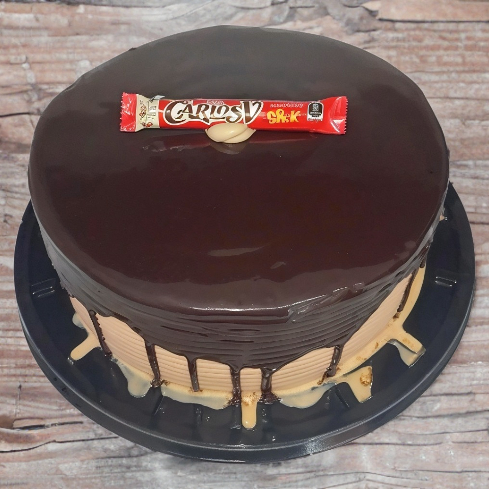 Pan de vanilla remojado en jarabe tres leches relleno de crema pastelera sabor Carlos V deorado con chantilly sabor chocolate y chocolate en la parte de arriba