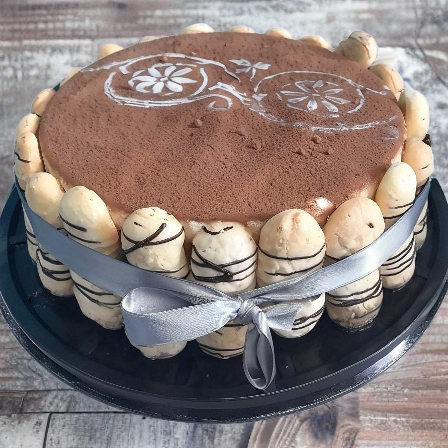 Pan de vainilla humedecido en jarabe de cafe rellno de queso philadlphia dulce decorado con soletas alrrededor y una capa en la parte superior de cocoa