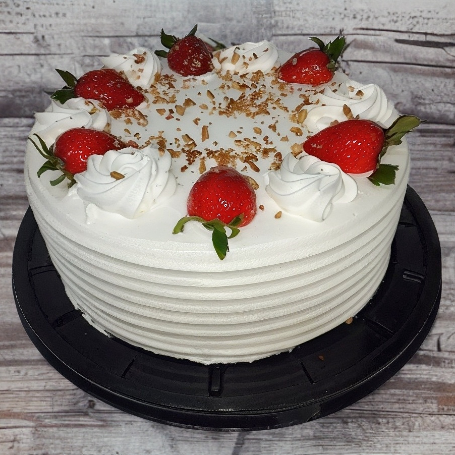 Pan de vainilla remojado en jarabe tres leches relleno de crema pastelera con fresa natural decorado con chantilly nuez espolvoreada y fresas naturales