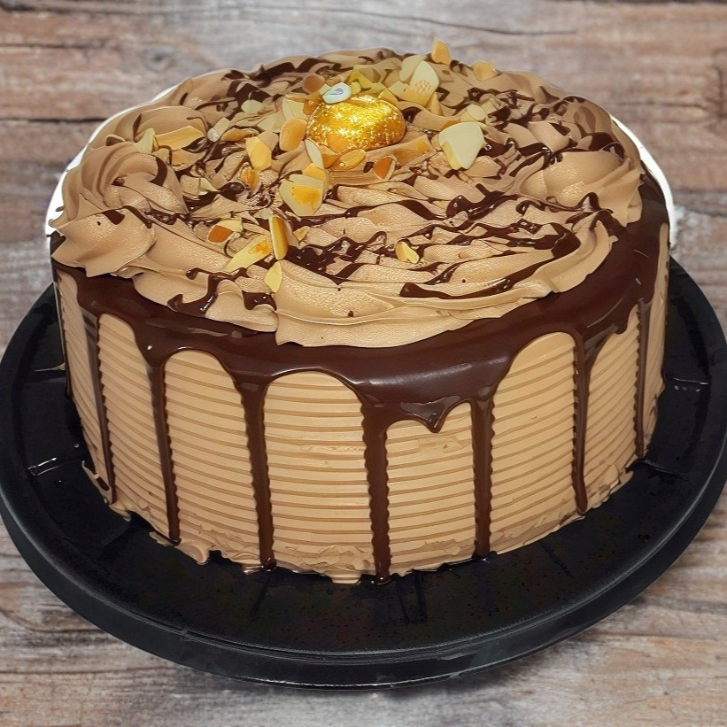 Pan de vainilla humedecido en jarabe tres leches con mouse de avellana, almedra tostada y chispas de chocolate decorado con cholate, almendras y un ferrero en la parte de enmedio