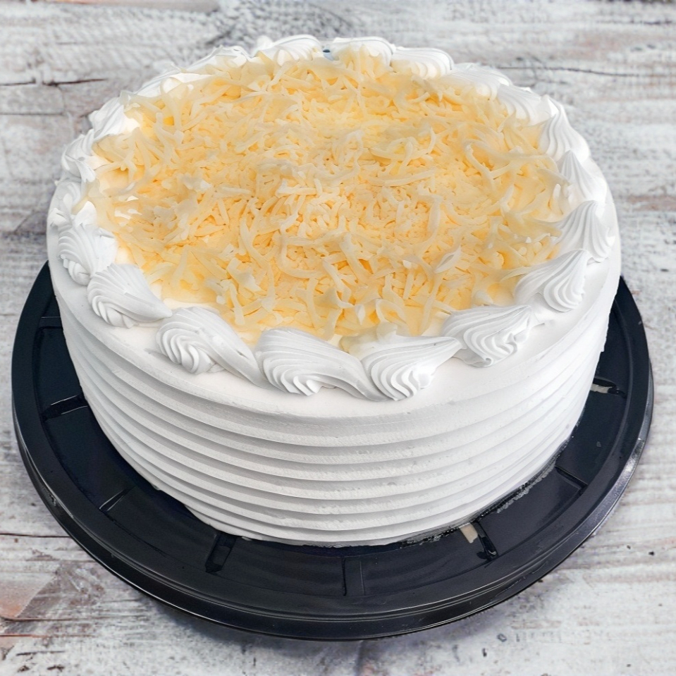 Pan de vanilla remojado en jarabe tres leches relleno de crema pastelera con coco tostado decorado con chantilly y coco