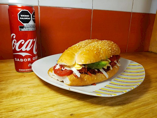 Con pan de telera, carne al pastor, salchicha y quesillo. Lleva aguacate,cebolla, jitomate, frijoles, mayonesa