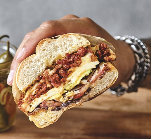 Tortas gigante de milanesa de pollo, quesillo, salchicha. Lleva mayonesa, frijoles, jitomate, cebolla, aguacate