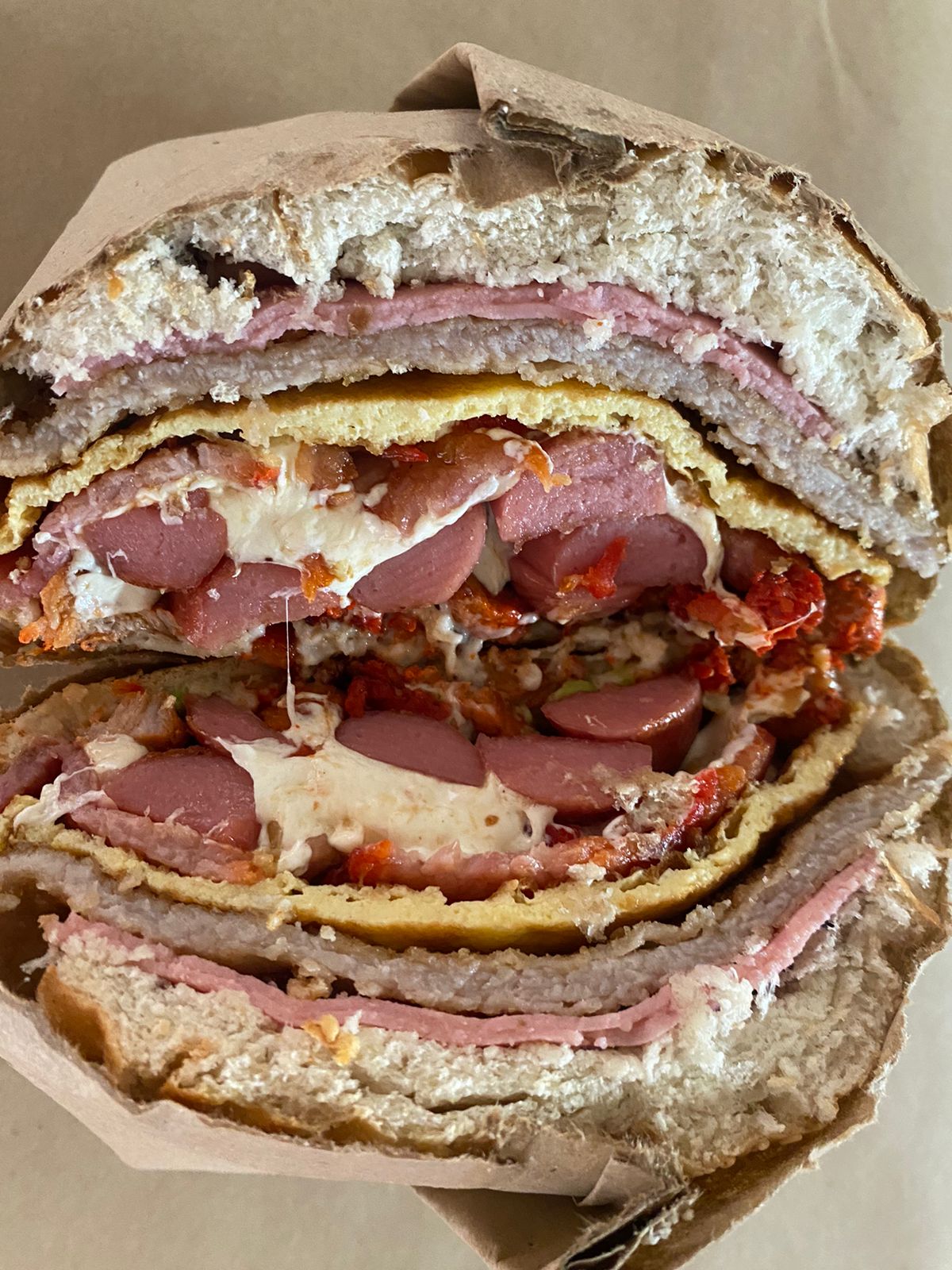 Tortas gigante de jamón, chuleta ahumada, salchicha, quesillo,Lleva mayonesa, frijoles, jitomate, cebolla, aguacate