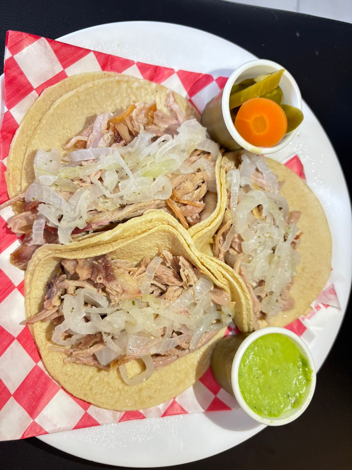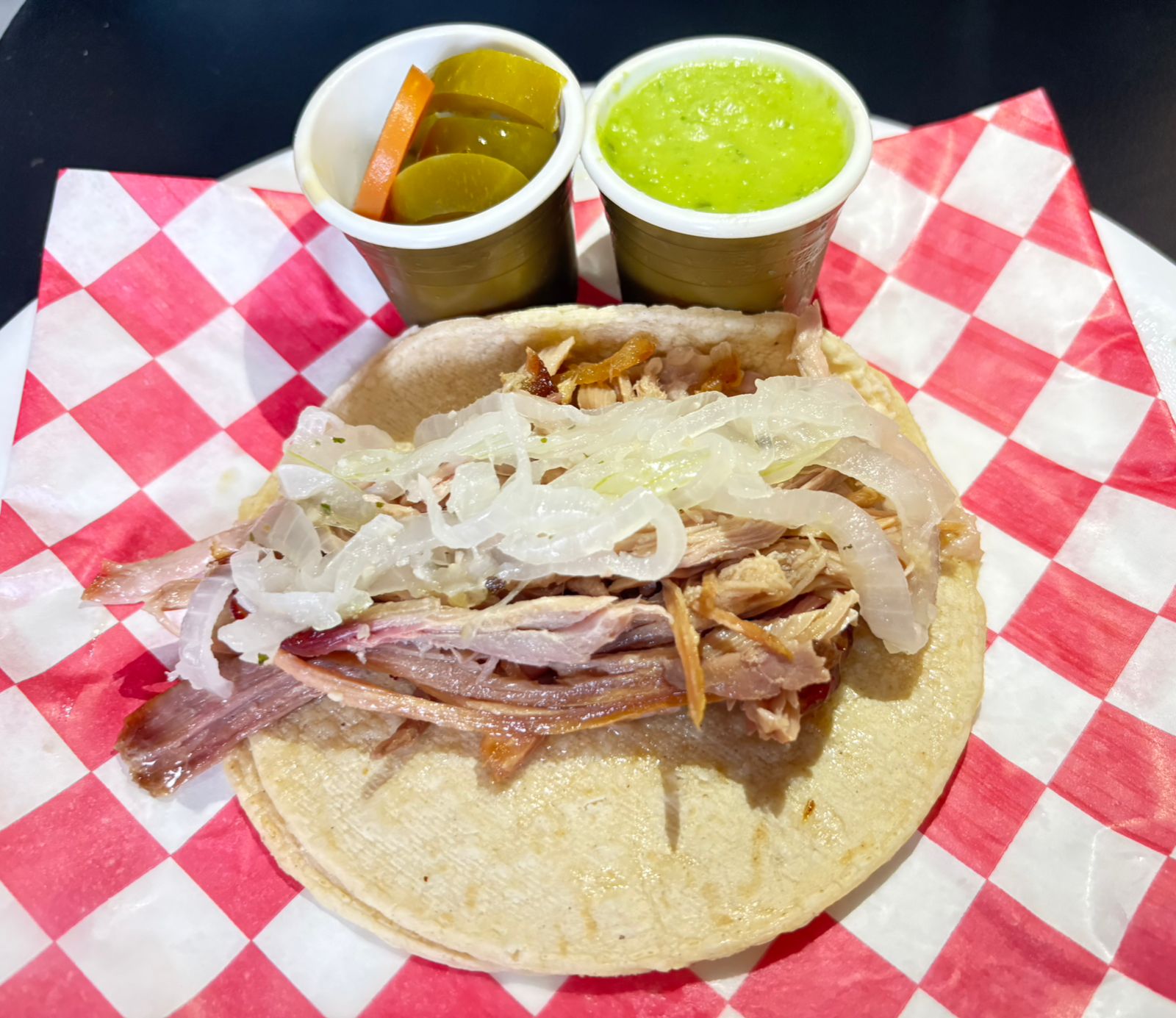 1 Taco (2 tortillas, lechón asado, mojito, cebollita acitronada) acompañada de la especialidad de la casa salsa verde (chiles🌶 serranos).