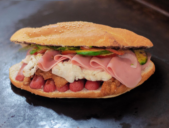 Torta gigante de jamon de pavo, chuleta, salchicha de pavo y quesillo. Lleva aguacate, cebolla, jitomate, mayonesa, frijoles.