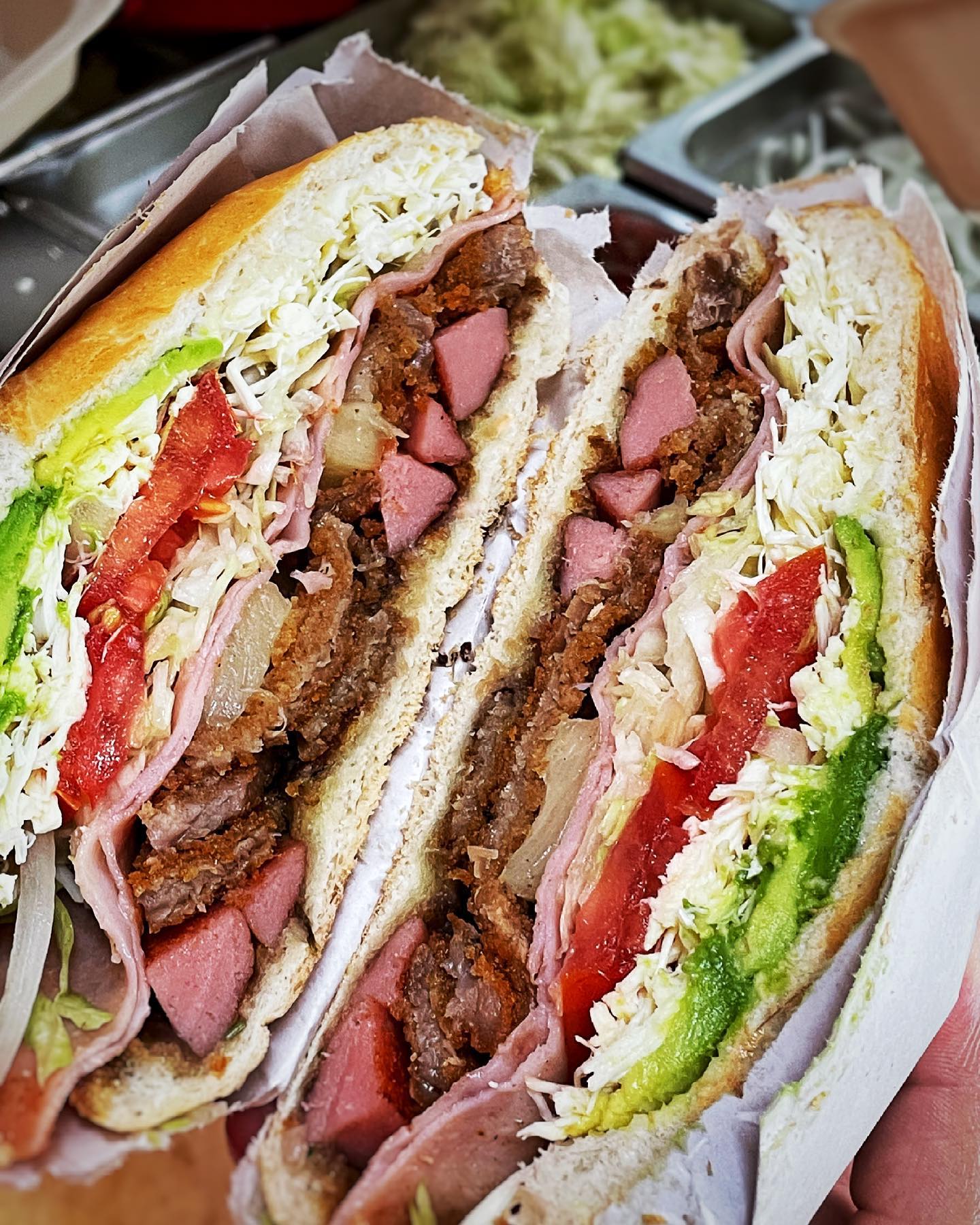 Tortas gigante de milanesa de cerdo, salchicha y quesillo. Lleva mayonesa, frijoles, jitomate, cebolla, aguacate