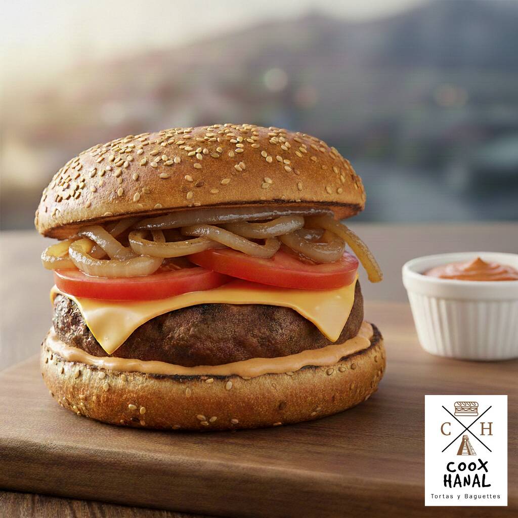 Carne de res elaborada casera, queso americano, cebolla, tomate y aderezo especial.