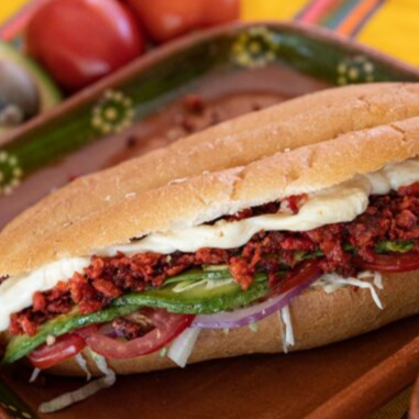 Pan bolillo, carne al pastor, piña, queso manchego, cebolla, cilantro, salsas, limón.