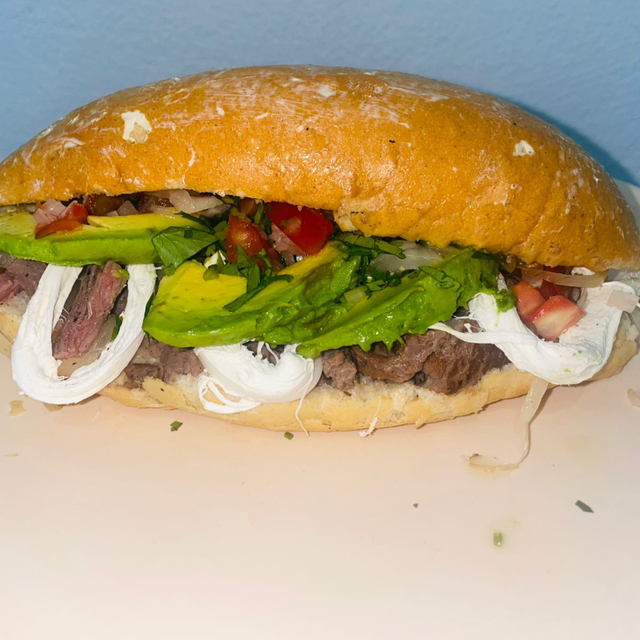 Pan bolillo, carne de res Sirloin, quesillo, aguacate, cebolla caramelizada, queso manchego, salsas, limón