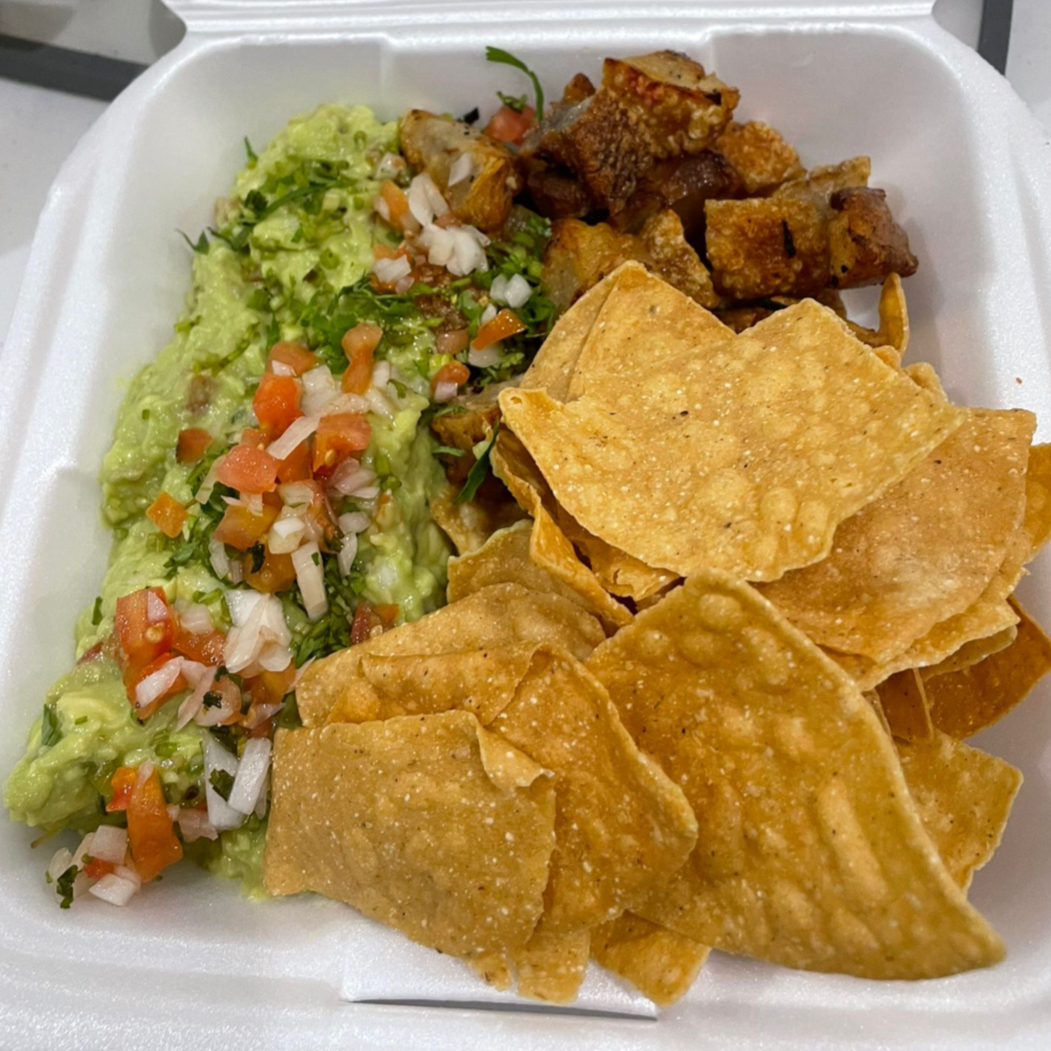 Guacamole, panza de cerdo crujiente, totopos, pico de gallo