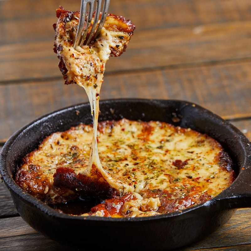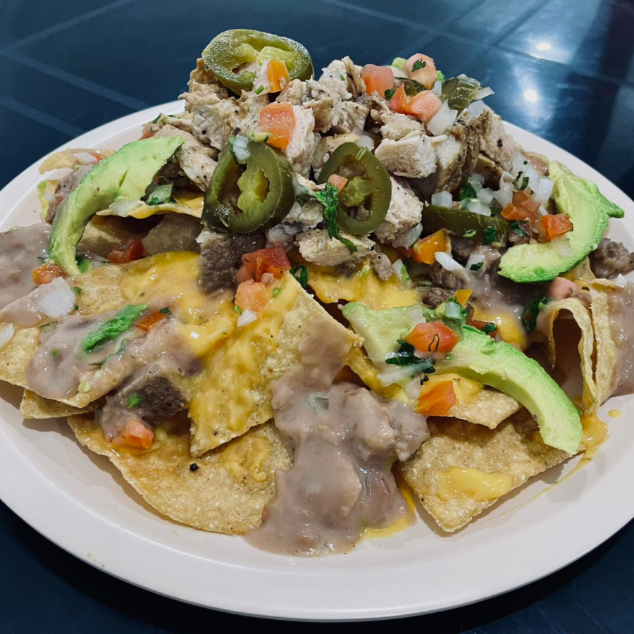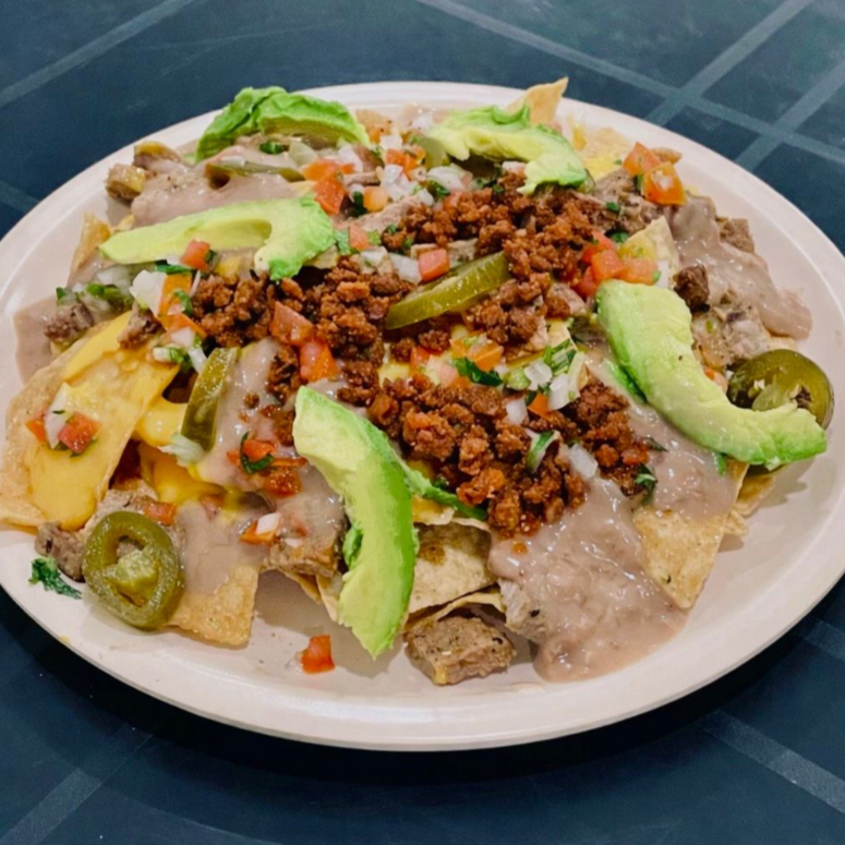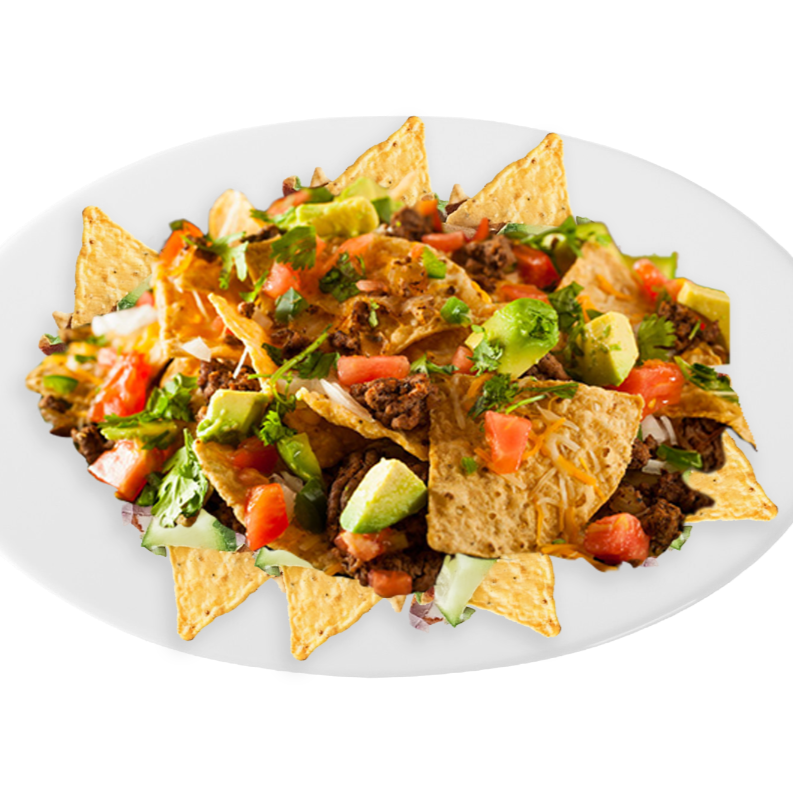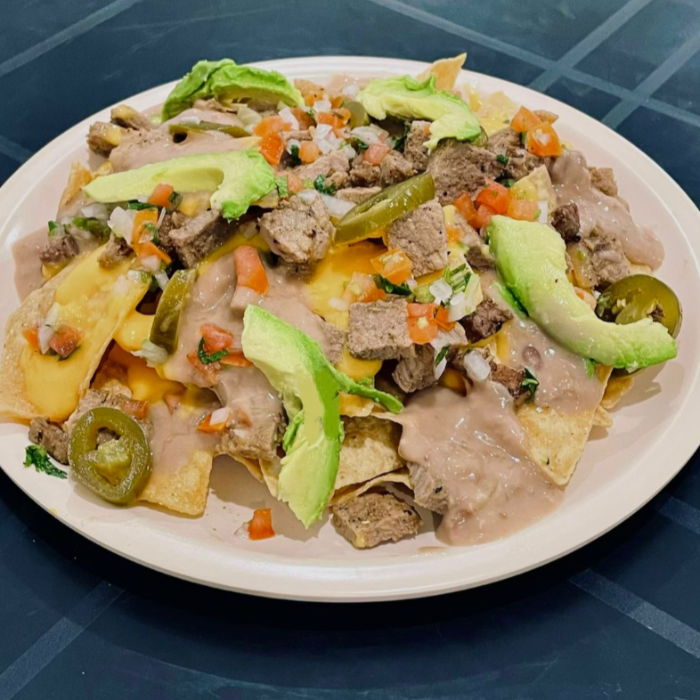 Totopos, salsa de queso cheddar, carne de res Sirloin, frijol, pico de gallo, aguacate, salsa