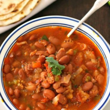 Frijoles charros, totopos, salsa tatemada