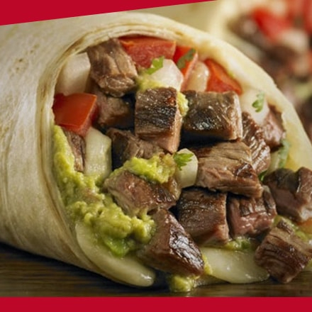 Tortilla de harina, carne de res Sirloin, frijol, queso Oaxaca, pico de gallo, aguacate, cebolla caramelizada, salsas