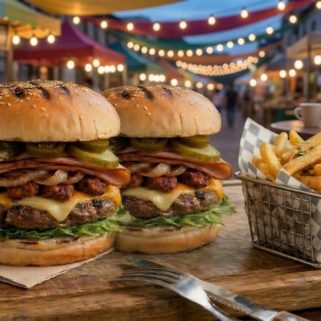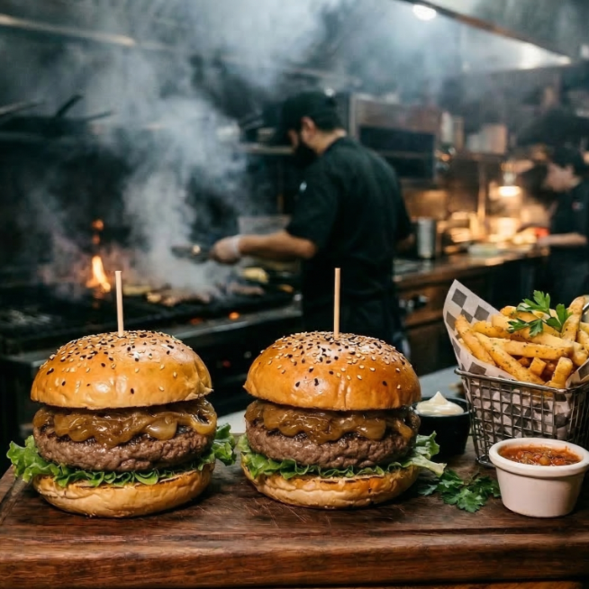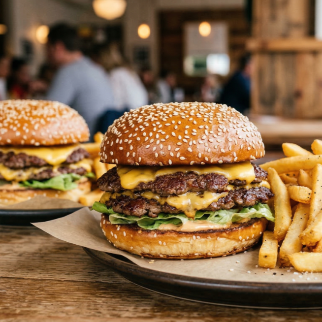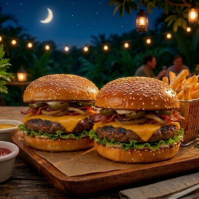 Pan Bimbo parrillero, 2 carnes de chuleta en cada hamburguesa, queso cheddar en lámina, jamón de pavo, y el toque dulce de nuestra cebolla asada, Lechuga romana fresca, pepinillos, jalapeños, porción de papas ala francesa y el trío clásico de aderezos: mayonesa, cátsup y mostaza.