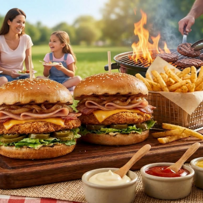 Pan Bimbo parrillero, 2 Hamburguesas de pollo empanizado, Tocino, queso cheddar en lámina, jamón de pavo y el toque dulce de nuestra cebolla asada, Lechuga romana fresca, pepinillos, jalapeños, porción de papas a la francesa y el trío clásico de aderezos: mayonesa, cátsup y mostaza.