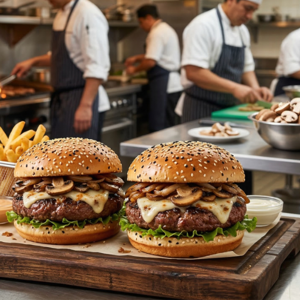 Pan Bimbo parrillero, carne 100% de res, Champiñones con queso Manchego fundido, Tocino, queso cheddar en lámina, jamón de pavo y el toque dulce de nuestra cebolla asada, Lechuga romana fresca, pepinillos, jalapeños, porción de papas a la francesa y el trío clásico de aderezos: mayonesa, cátsup y mostaza.