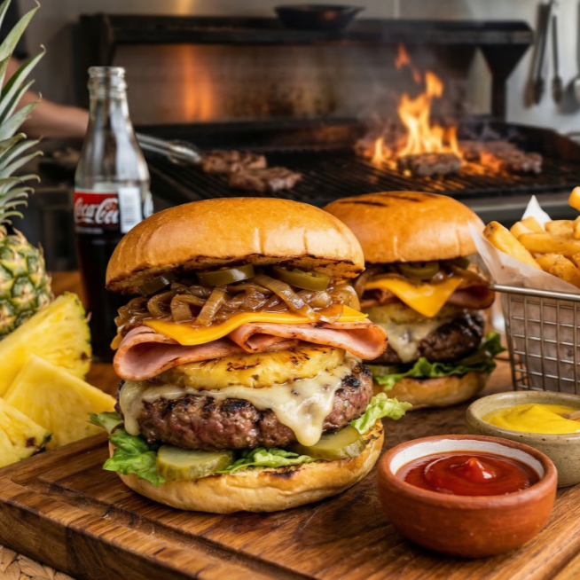 Pan Bimbo parrillero, carne 100% de res, Piña asada y queso manchego fundido, queso cheddar en lámina, jamón de pavo y el toque dulce de nuestra cebolla asada, Lechuga romana fresca, pepinillos, jalapeños, porción de papas a la francesa y el trío clásico de aderezos: mayonesa, cátsup y mostaza.
