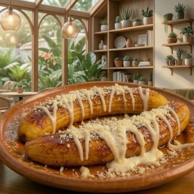 Deliciosos plátanos fritos acompañados con; Crema, Lechera y queso sopero.