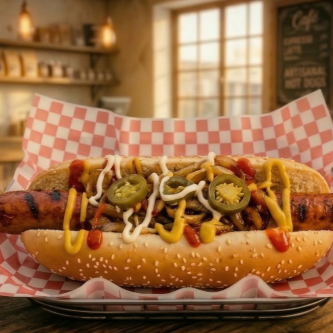 Hotdog Jumbo con pan Bimbo Wonder Jumbo, Salchicha de pavo jumbo, el toque dulce de nuestra cebolla asada, chiles jalapeños, y el trío clásico de aderezos: mayonesa, cátsup y mostaza.