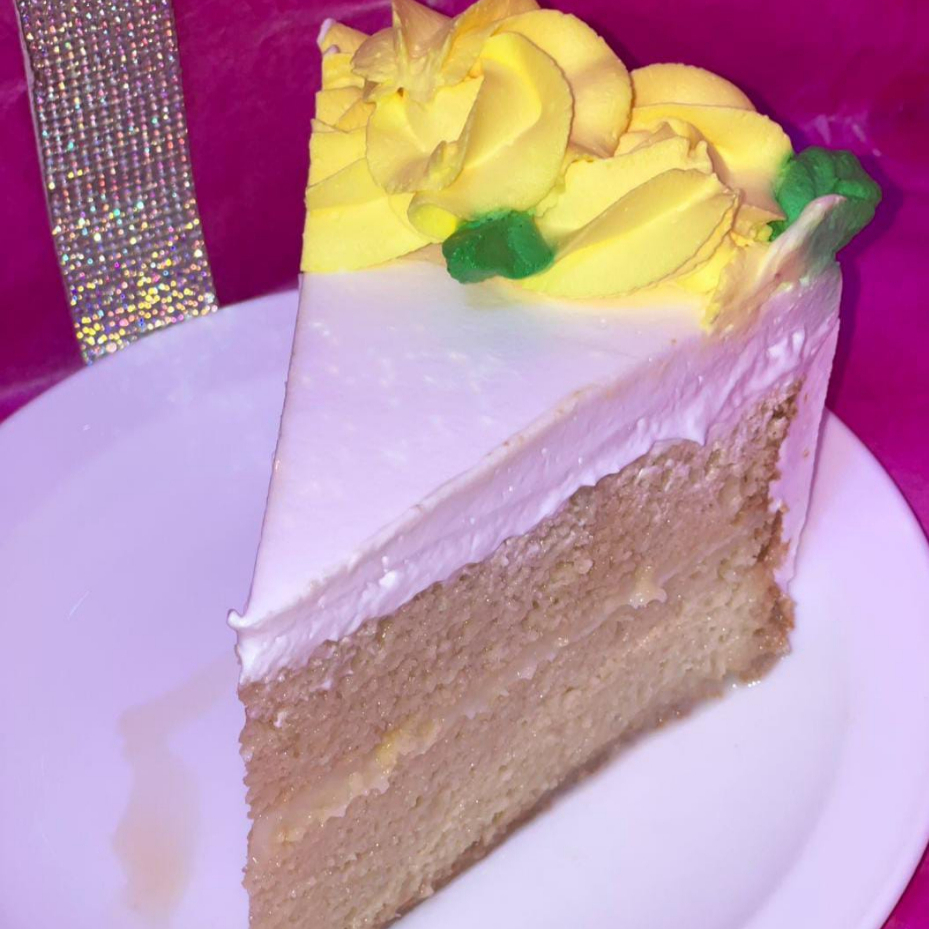 Rebanada de pastel, pan de vainilla empapado con una rica mezcla de 3 leches, relleno de una deliciosa crema de vainilla y cubierto con una ligera capa de Chantilly de vainilla.