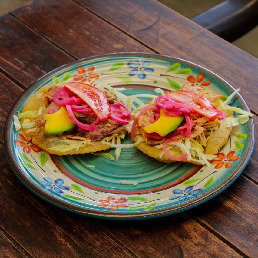 Tortillas a mano crujientes, rellenas de frijol, servidas con proteína a su gusto, lechuga, aguacate, cebolla morada y tomate