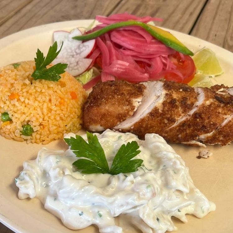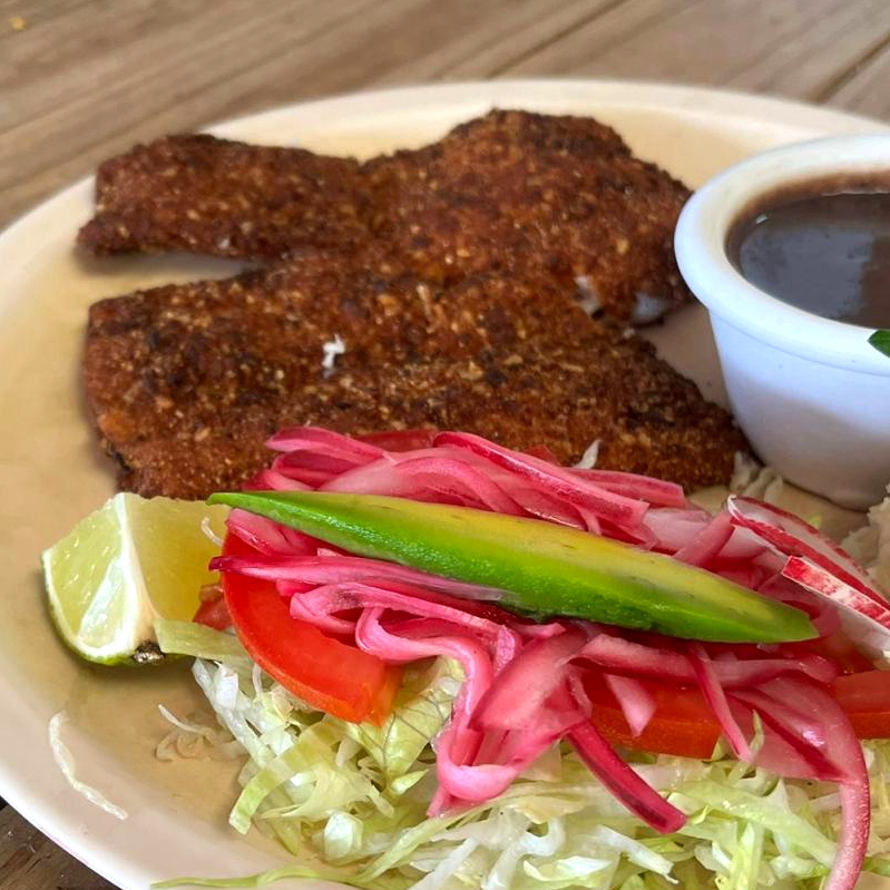 Filete de tilapia empanizado con guarniciones a su gusto y ensalada.