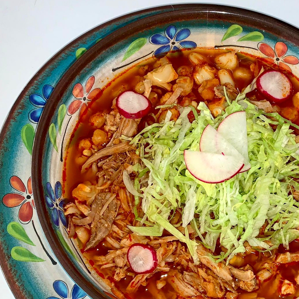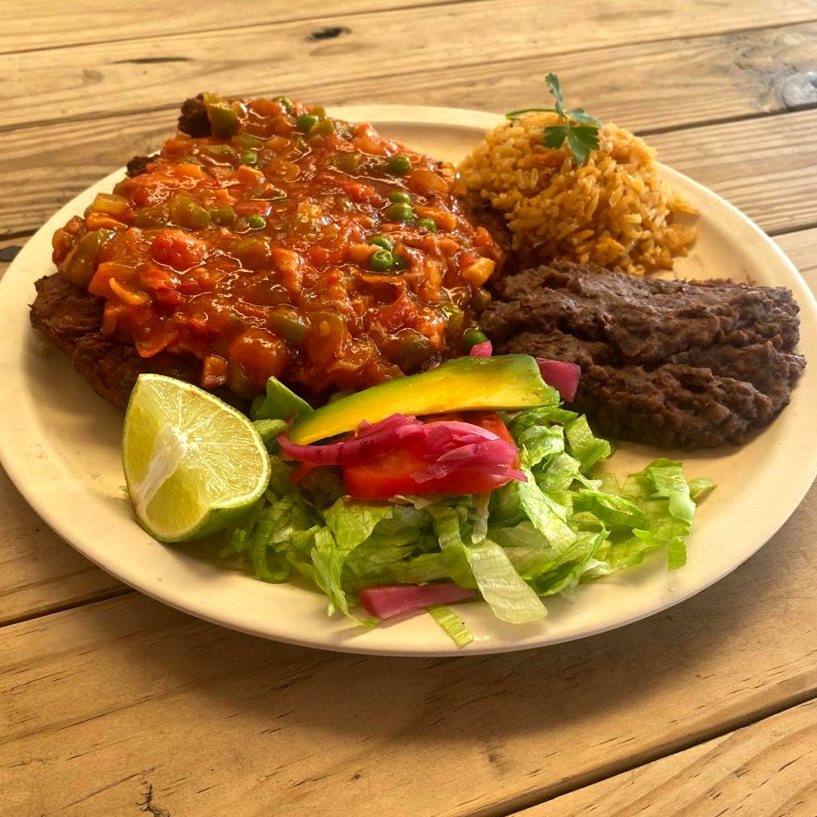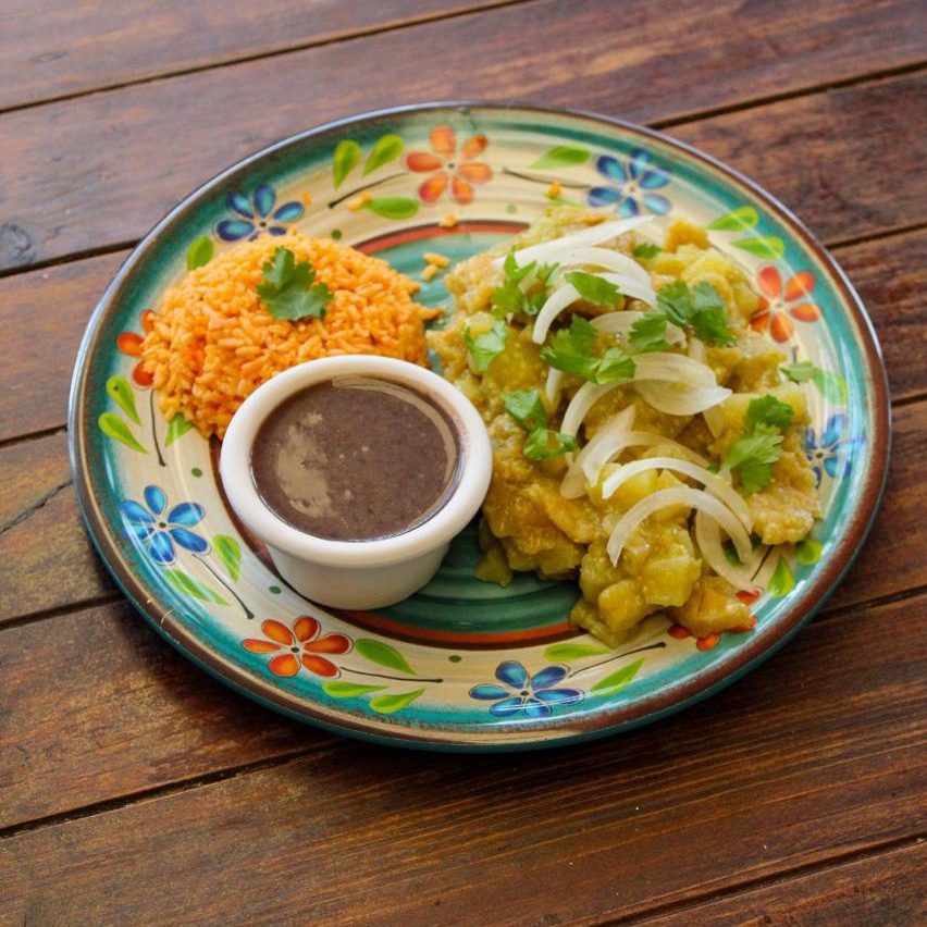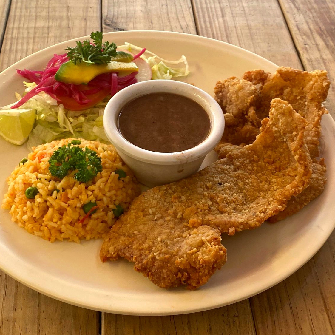 Tortillas hechas a mano, fritas servidas con proteína a su gusto, lechuga, aguacate, cebolla morada y tomate