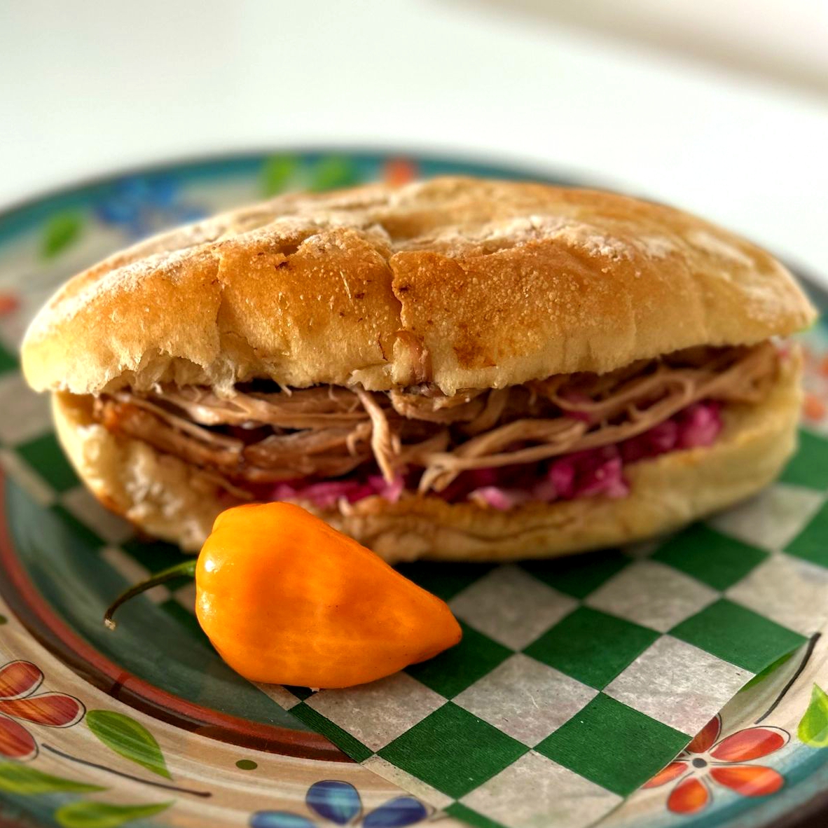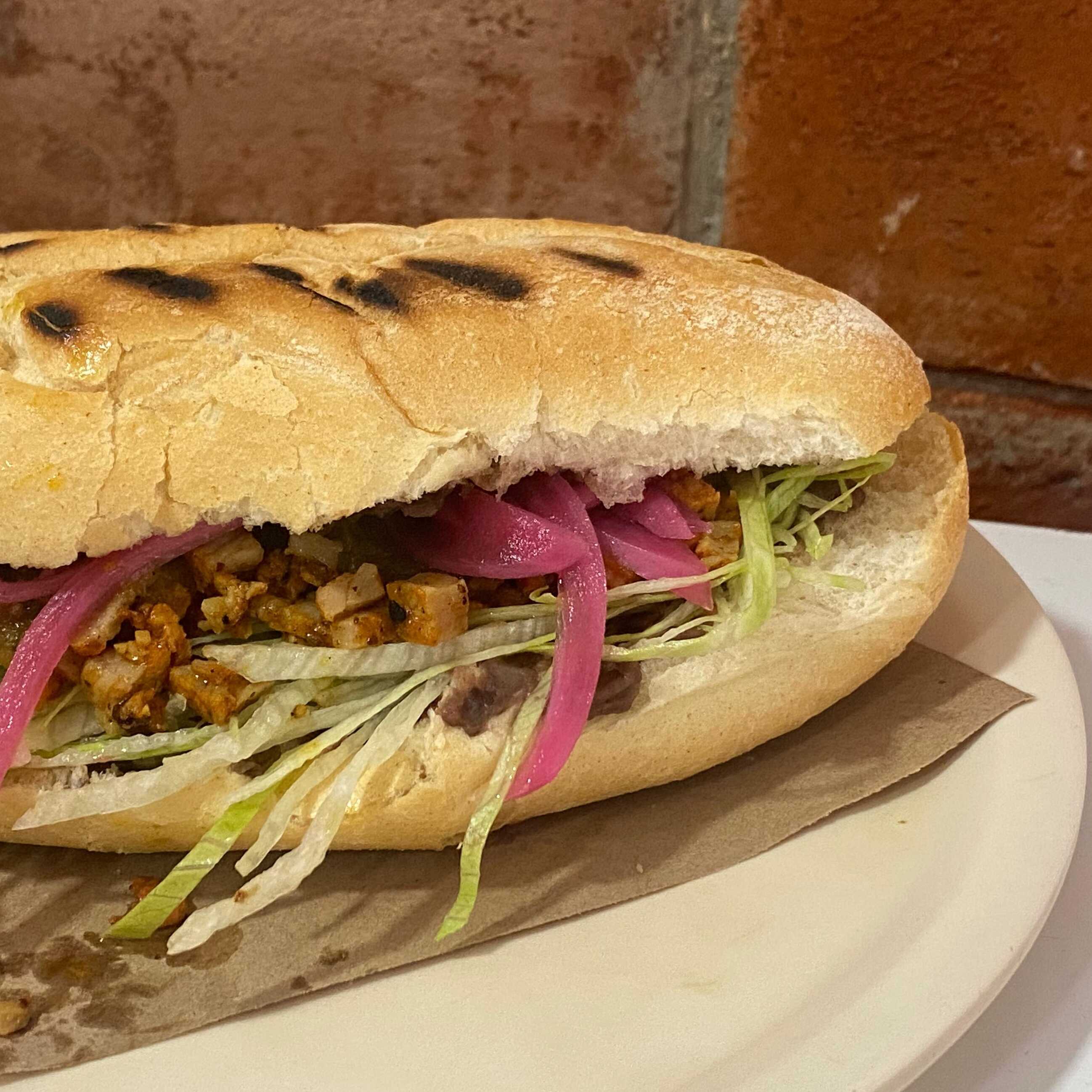 Rellena con carne de cerdo asada, acompañada de frijol, lechuga, aguacate y chiltomate