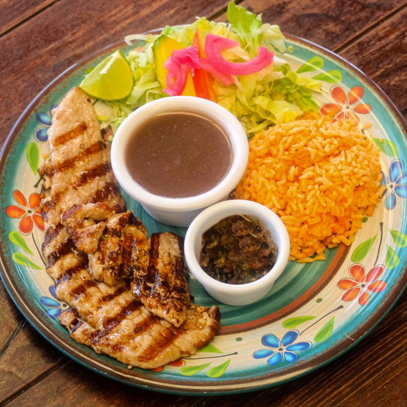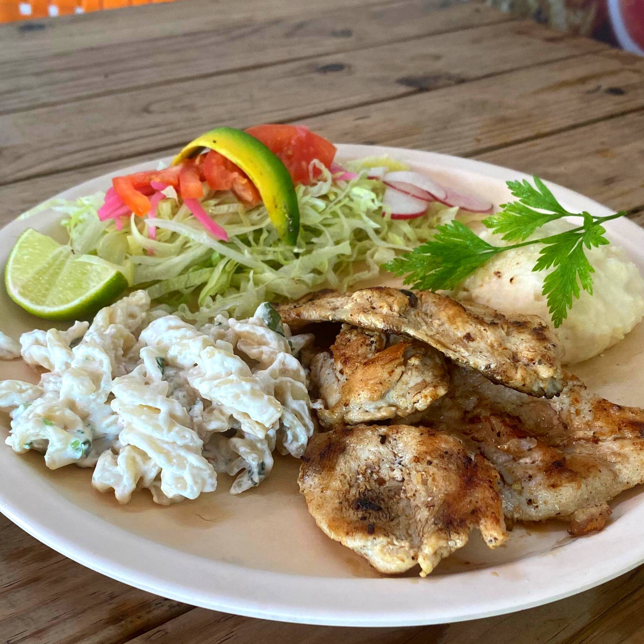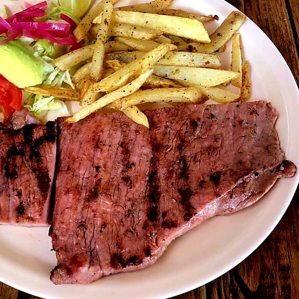 Marinado con sal, ajo, pimienta y limon. Acompañado con guarniciones a su gusto y ensalada