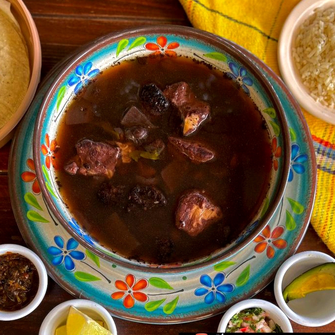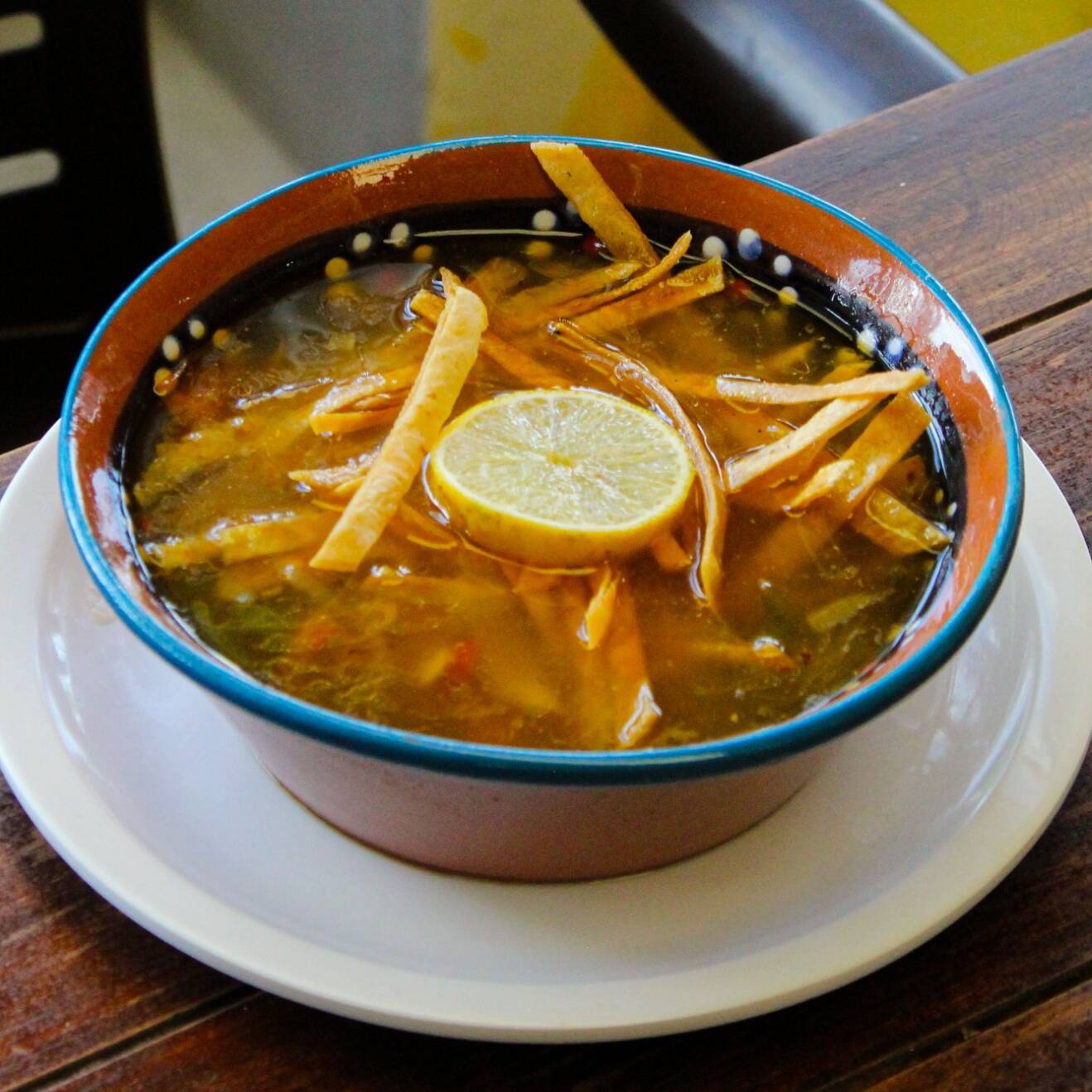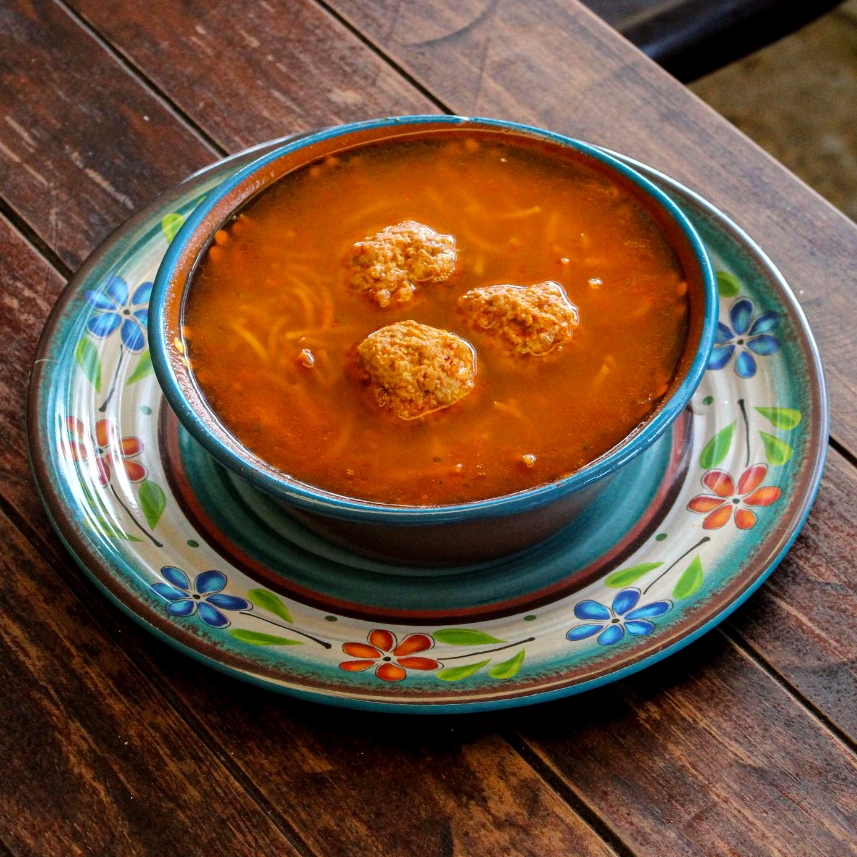 Albondigas caldosas, llevan fideos, chayote y zanahoria. Acompañadas con cebolla y limon