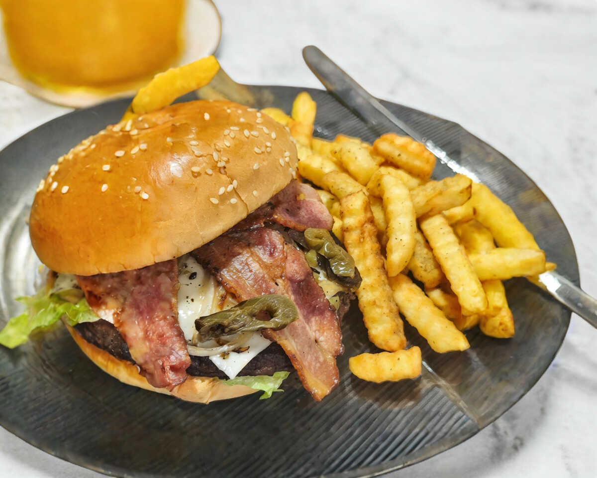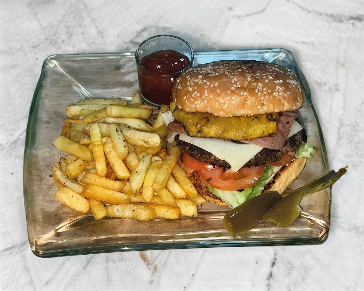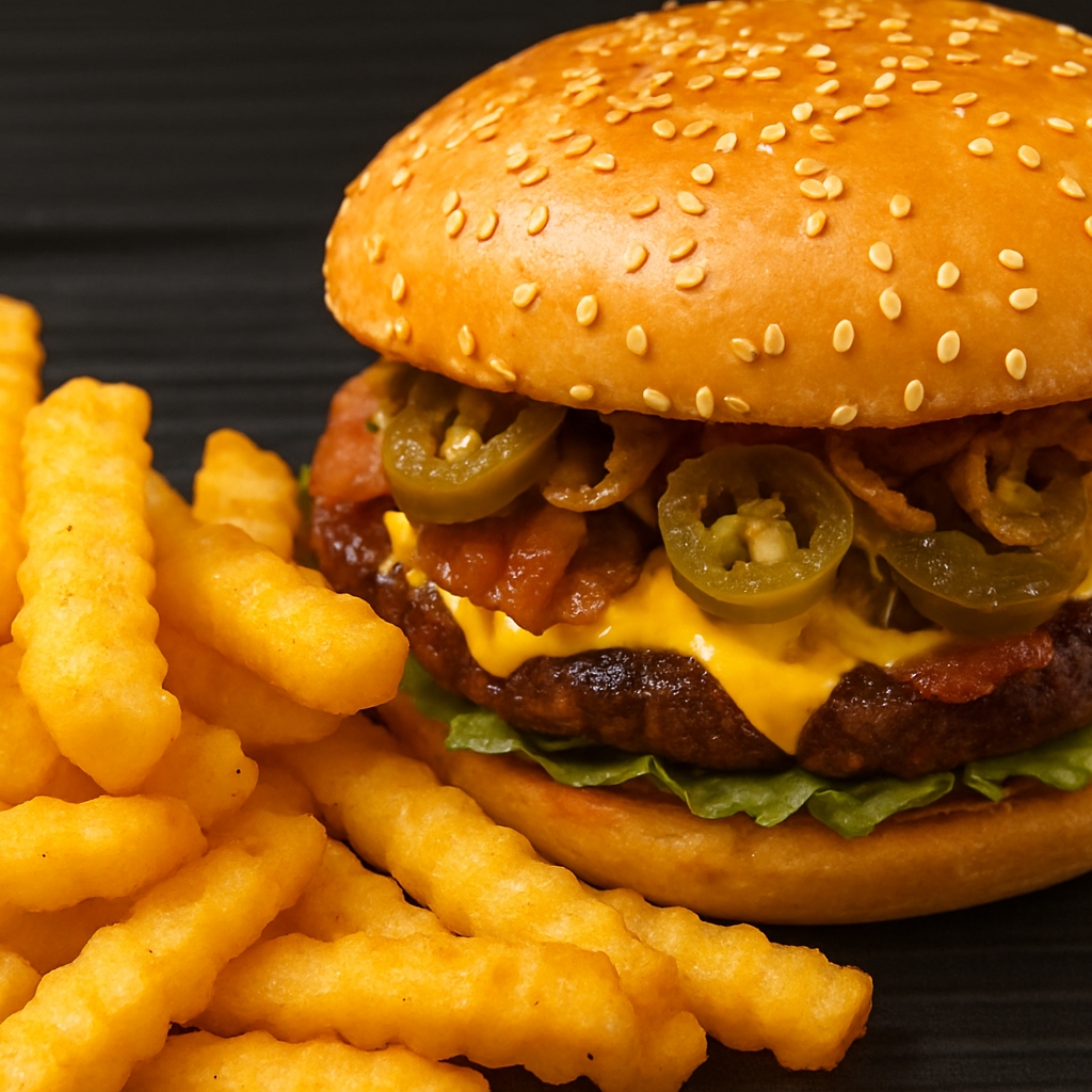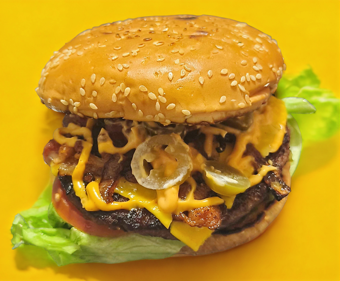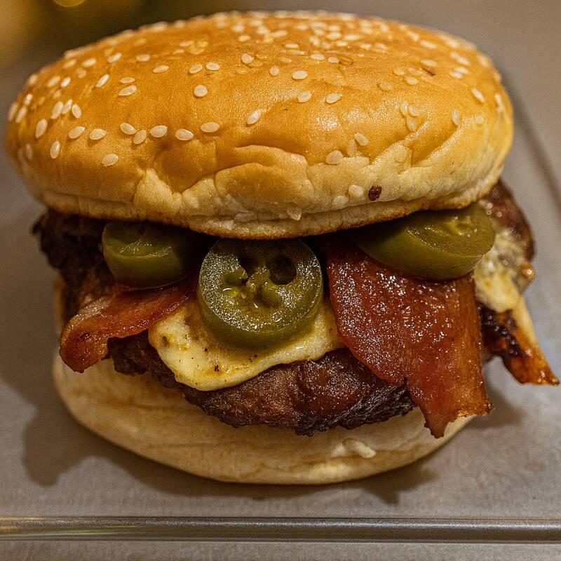 Mayonesa, Lechuga, Tomate, Pepinillos, Cebolla Asada, 2 Carnes De Res Con Queso Americano, Queso Jalapeño Y Tocino