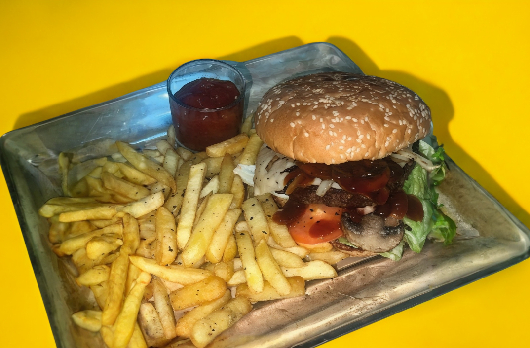 Hamburguesa BBQ Champiñon*1 + Papas Onduladas*1 + 7up Lata 355 ml*1