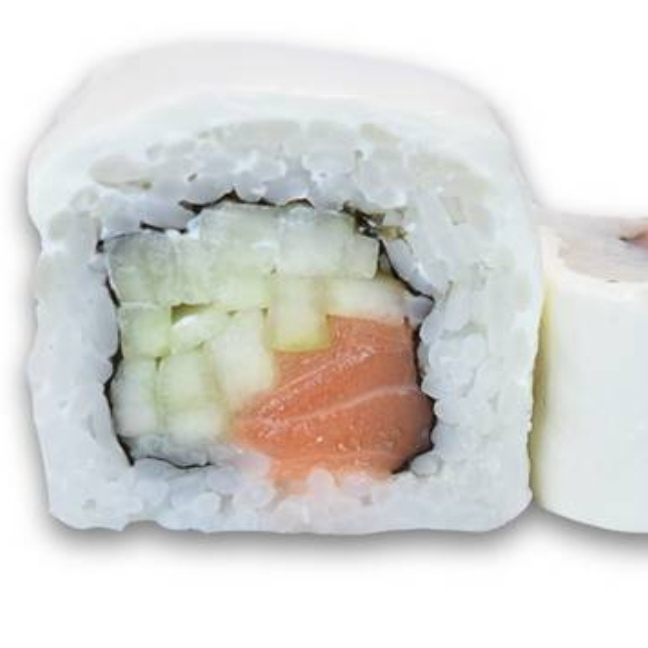 Por dentro lleva pepino y salmón cubierto de queso filadelfia