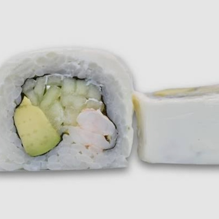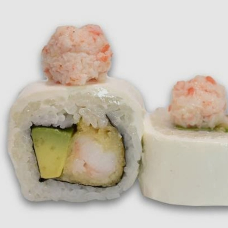 Relleno de aguacate, pepino y camarónes cocidos y cubierto con queso filadelfia