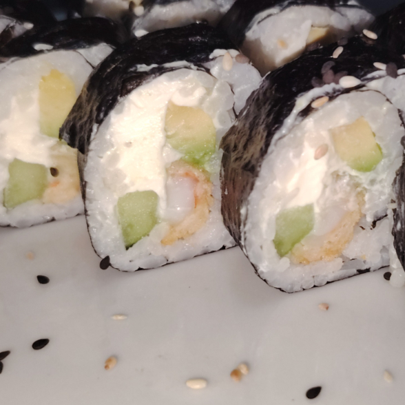 Relleno de queso filadelfia, aguacate, pepino y camarón empanizado. Cubierto con alga por fuera y ajonjoli