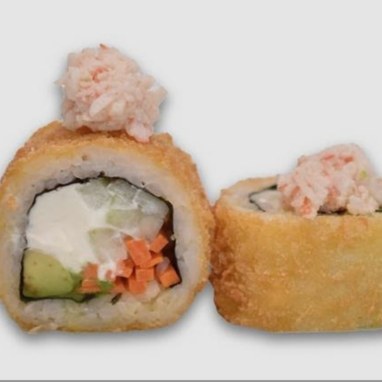Rollo empanizado relleno de queso filadelfia, aguacate, pepino y zanahoria con topin de tampico y camarónes