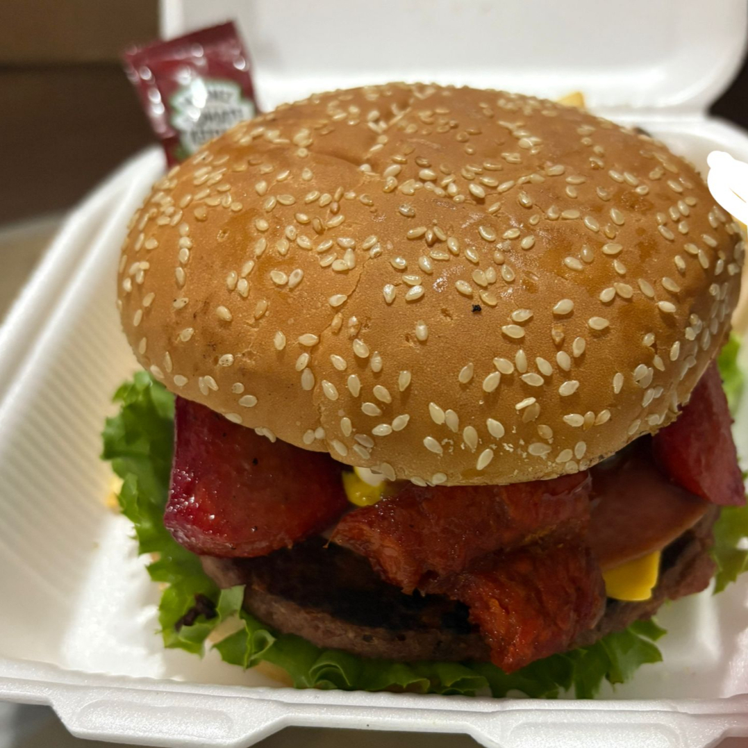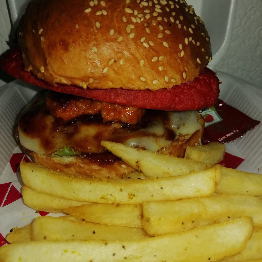 CARNE DE RES, TOCINO, JAMON, QUESO AMARILLO, PIÑA, TOMATE, CEBOLLA, LECHUGA, Y ADEREZOS DE LA CASA