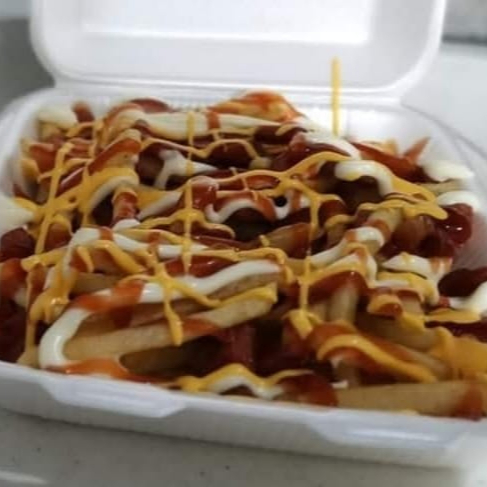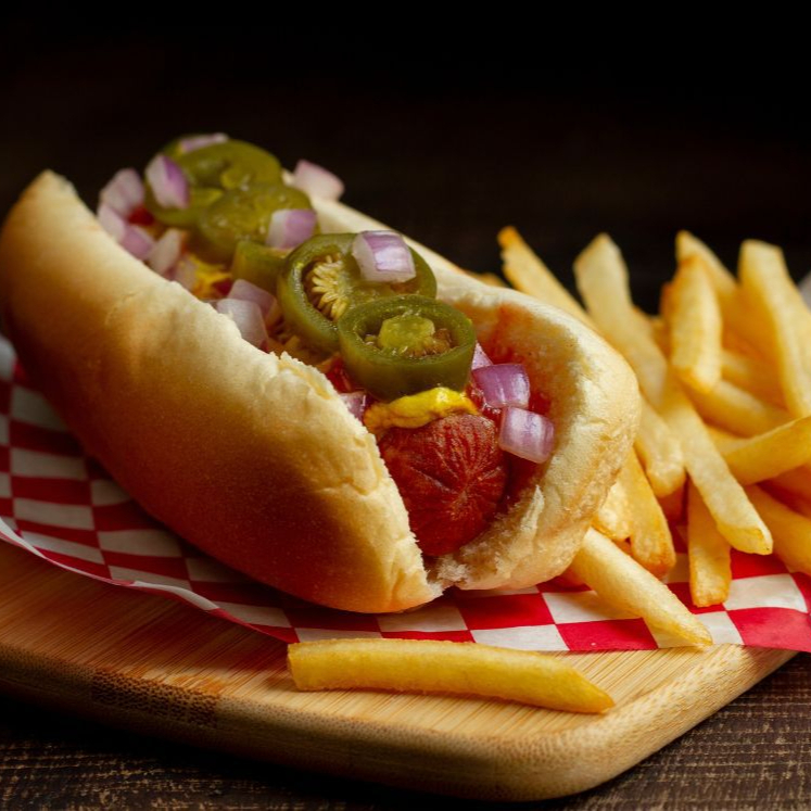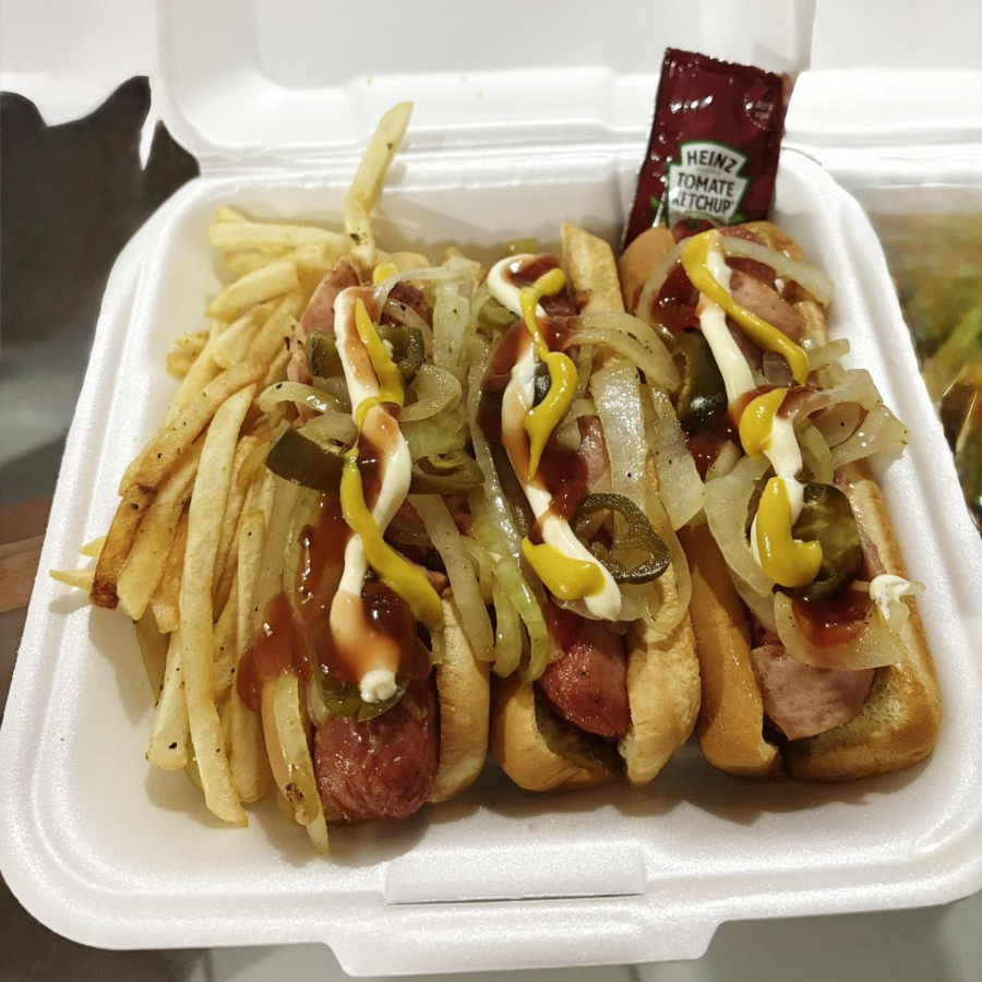 Salchichas Frankfurt jumbo, tocino y aderezos de la casa con papas