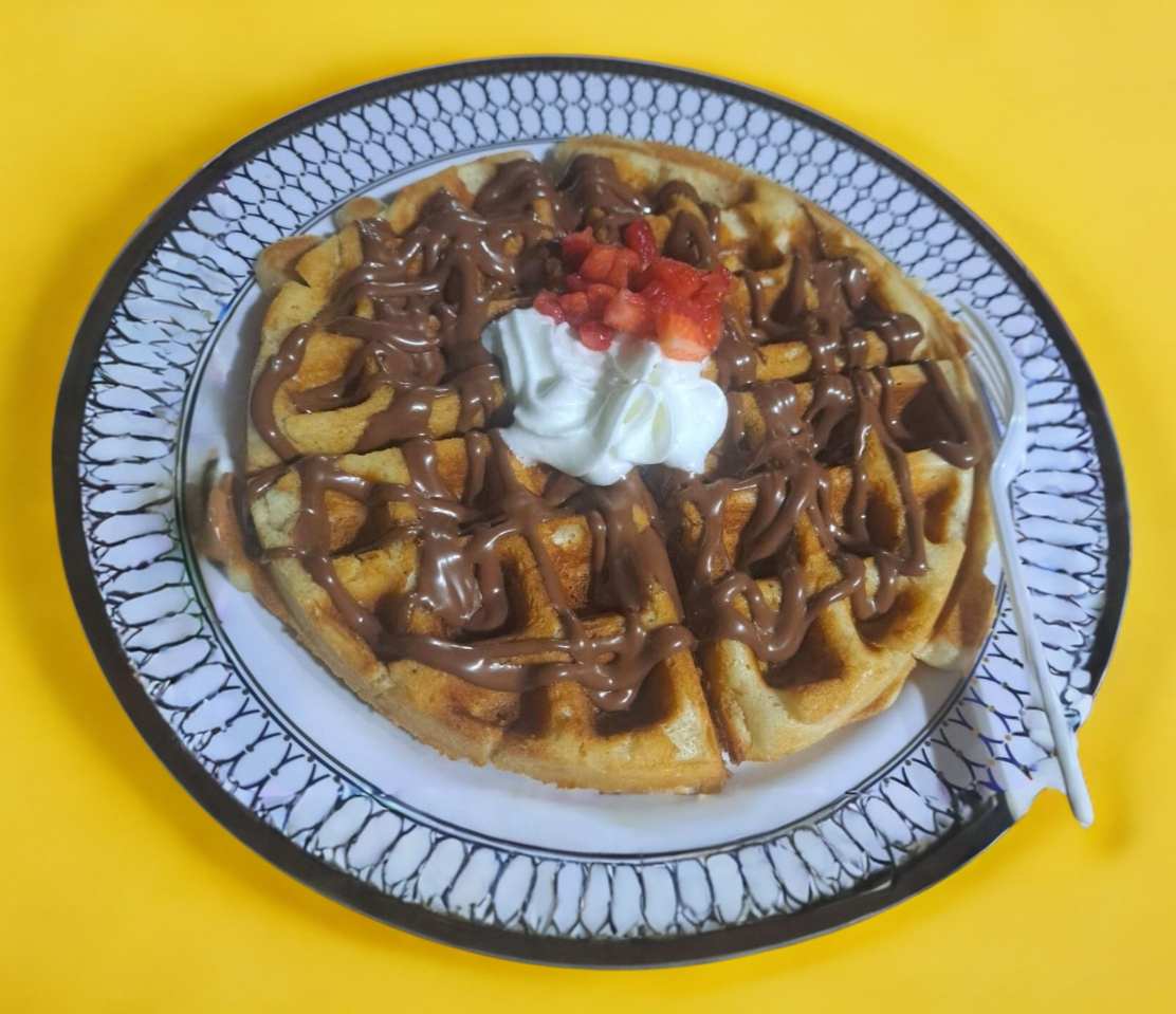 Waffle salado con Jamon, queso manchego, tomate, lechuga y aguacate, + PAPAS SABRITA.