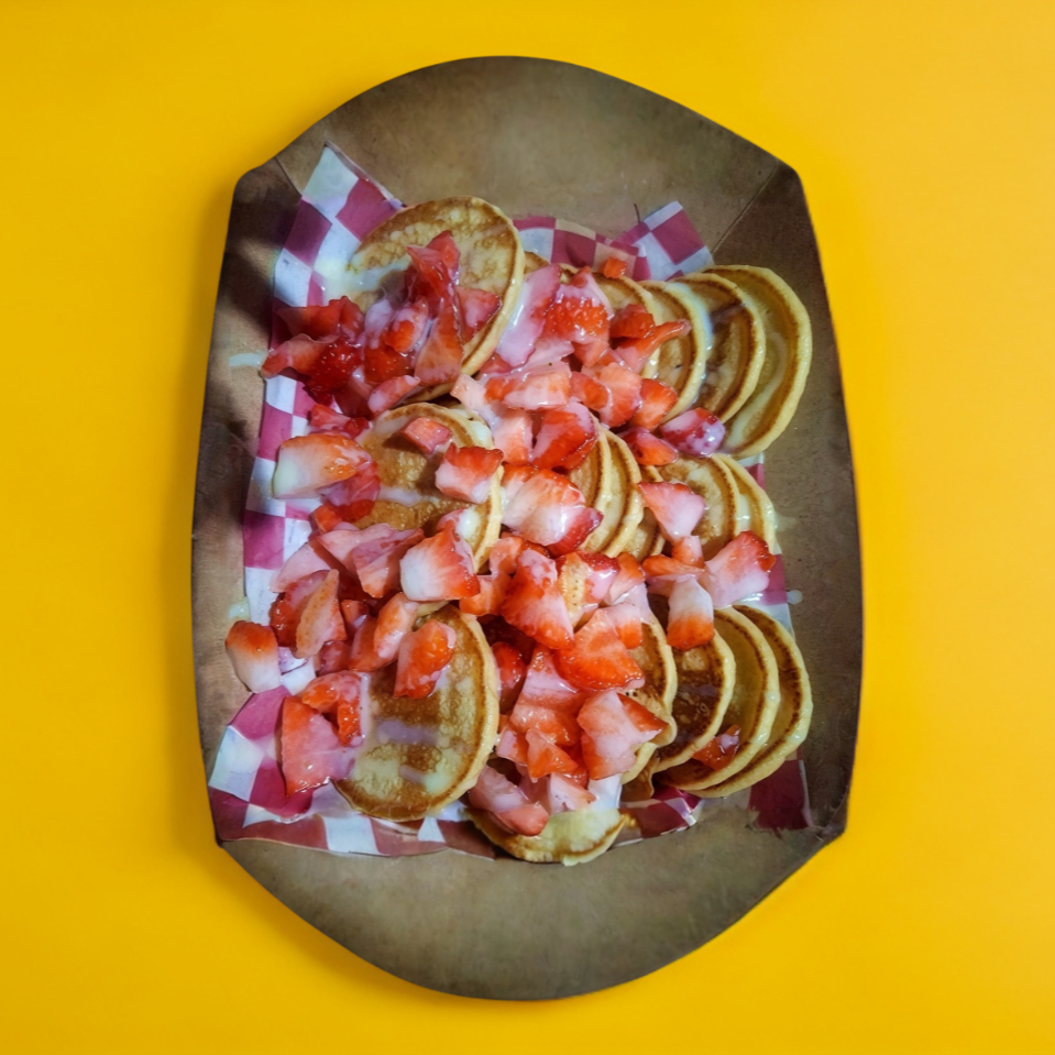 Orden de 35pz de mini hotcakes; con jarabe a elegir, fruta y topping