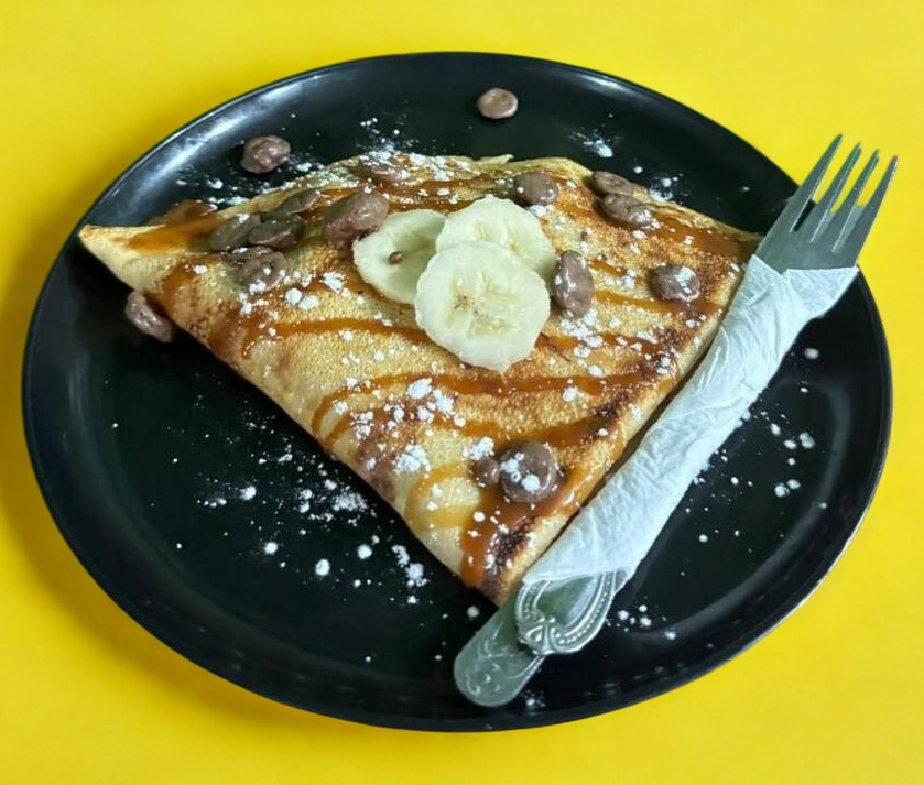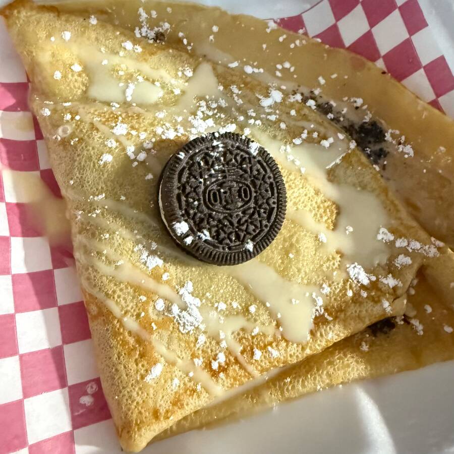 Crepa preparada con lechera y galleta oreo espolvoreada