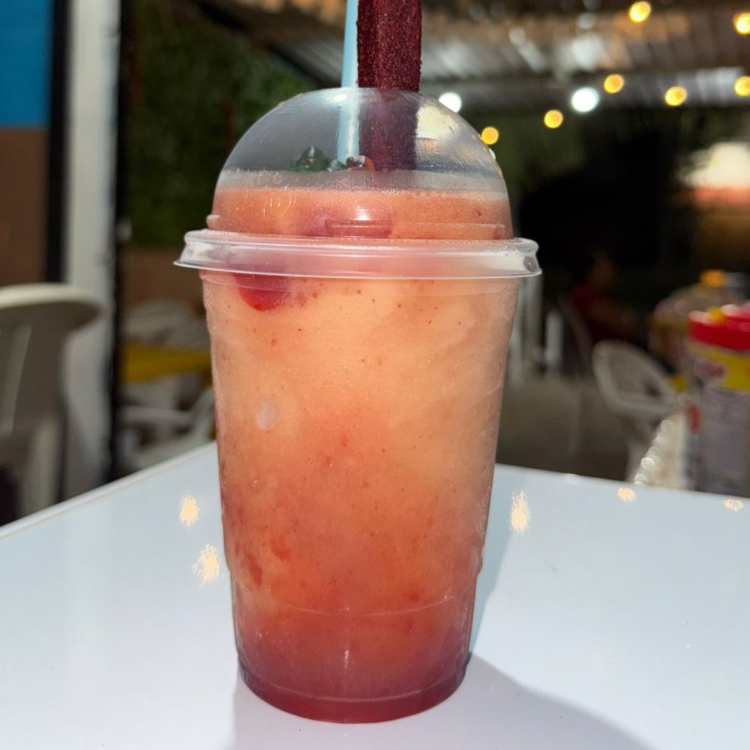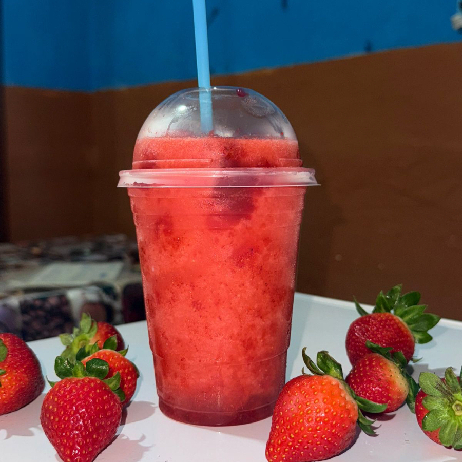 Smoothie elaborado con agua, fresas naturales, pica fresas, azúcar, chamo y Miguelito
