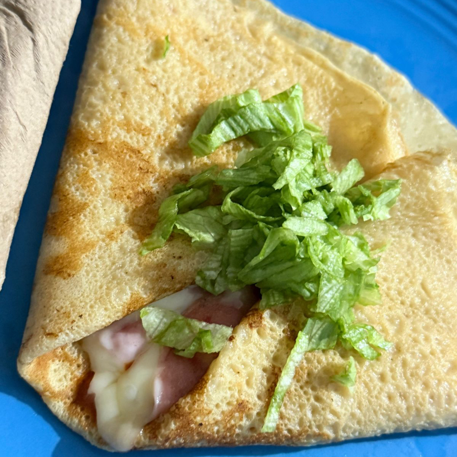 Crepa Salada; Jamón de pavo, queso manchego, salsa pizzera y lechuga de decoración.