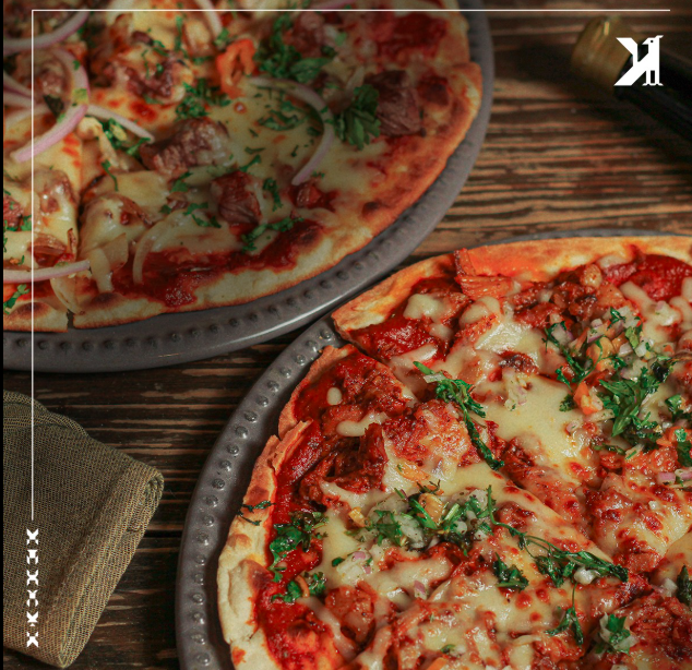 Salsa pomodoro, queso mozzarella, arrachera acompañada de cebolla morada, pimiento morron y aceituna negra.