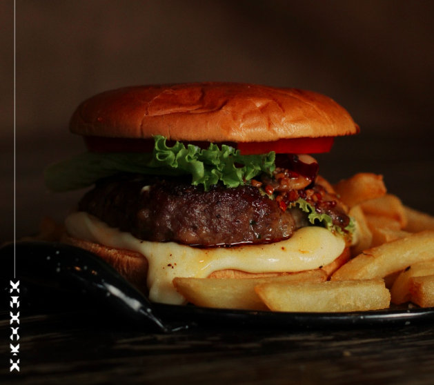 Carne de res, queso cheddar, tocino, cebolla caramelizada, piña y aderezo de aguacate con guarnicion de papas cambray.
