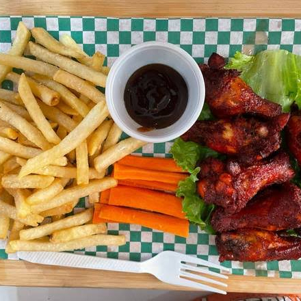 5 alitas, a elegir una salsa y 85 gr de papas