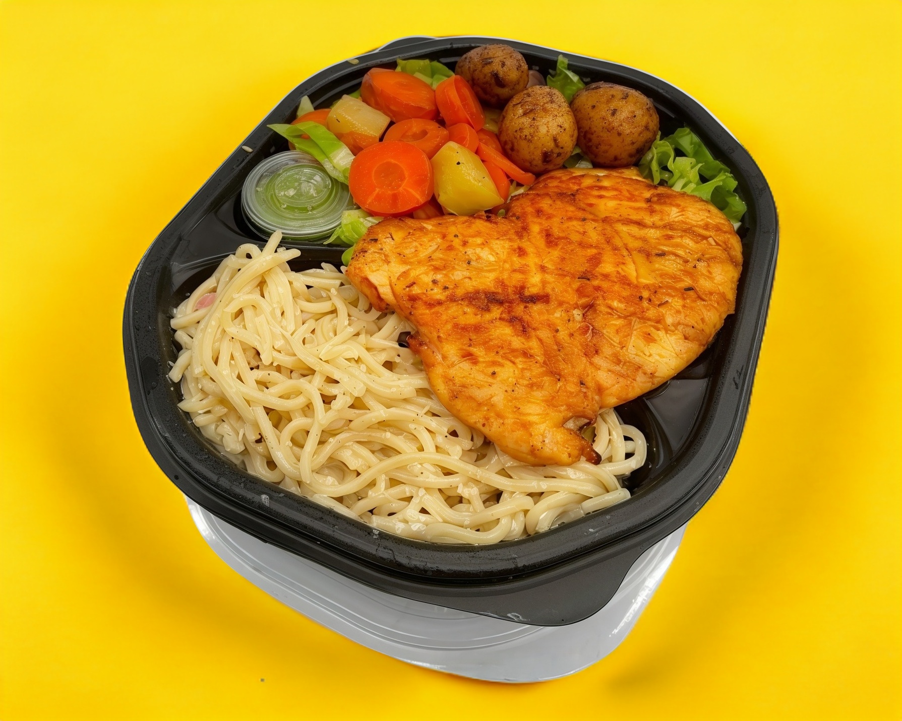 Disfruta de una jugosa pechuga de pollo asada (100g) acompañada de tu elección de arroz o spaghetti (150g). Incluye un mix de verduras salteadas (zanahoria, chayote, papa) sobre una cama de fresca lechuga, acompañado con un huevo cocido.