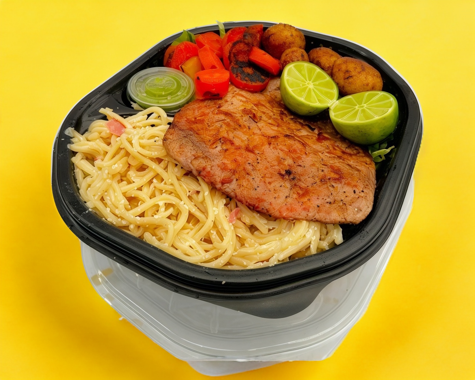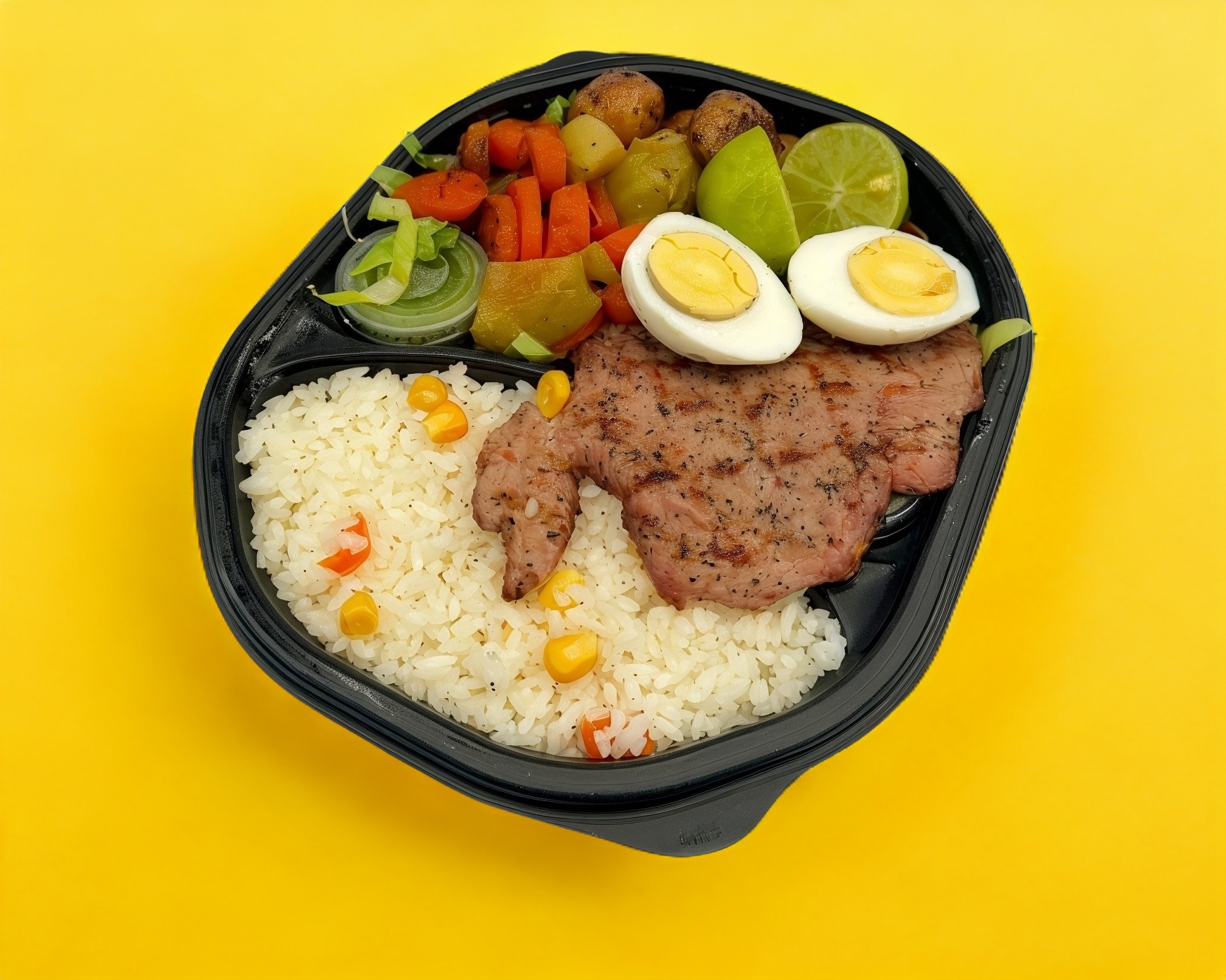 Sacia tu apetito con nuestro bistec de res (110g) perfectamente asado. Acompañado de tu elección de arroz o spaghetti (150g), verduras salteadas (zanahoria, chayote, papa) y crujiente lechuga, en compañía de un huevo cocido.