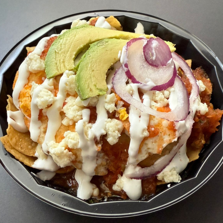 Totopos salados bañados con la salsa del día picosa, con huevo estrellado, lleva con cama de frijoles y se acompaña con queso manchego, crema, aguacate y cebolla.